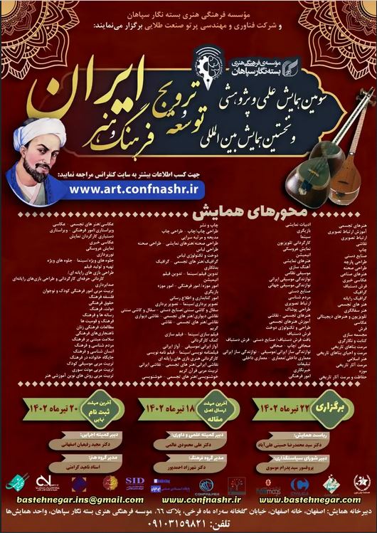 سومین همایش علمی پژوهشی و نخستین همایش بین المللی توسعه و ترویج فرهنگ و هنر ایران در تاریخ ۲۲ تیر ۱۴۰۲ توسط ،موسسه فرهنگی هنری بسته نگار سپاهان شرکت فناوری و مهندسی پرتو صنعت طلایی در شهر اصفهان برگزار خواهد شد.با توجه به اینکه این همایش به صورت رسمی برگزار می گردد، کلیه مقالات این کنفرانس در پایگاه سیویلیکا و نیز کنسرسیوم محتوای ملی نمایه خواهد شد و شما می توانید با اطمینان کامل، مقالات خود را در این همایش ارائه نموده و از امتیازات علمی ارائه مقاله کنفرانس با دریافت گواهی کنفرانس استفاده نمایید.