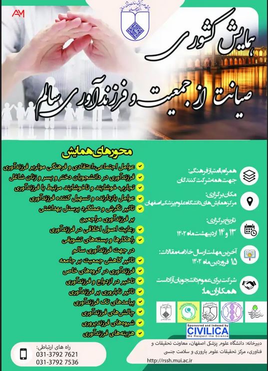 همایش کشوری صیانت از جمعیت و فرزندآوری سالم در تاریخ ۱۳ اردیبهشت ۱۴۰۲ توسط دانشگاه علوم پزشکی و خدمات بهداشتی درمانی اصفهان، در شهر اصفهان برگزار خواهد شد.با توجه به اینکه این همایش به صورت رسمی برگزار می گردد، کلیه مقالات این کنفرانس در پایگاه سیویلیکا و نیز کنسرسیوم محتوای ملی نمایه خواهد شد و شما می توانید با اطمینان کامل، مقالات خود را در این همایش ارائه نموده و از امتیازات علمی ارائه مقاله کنفرانس با دریافت گواهی کنفرانس استفاده نمایید.
